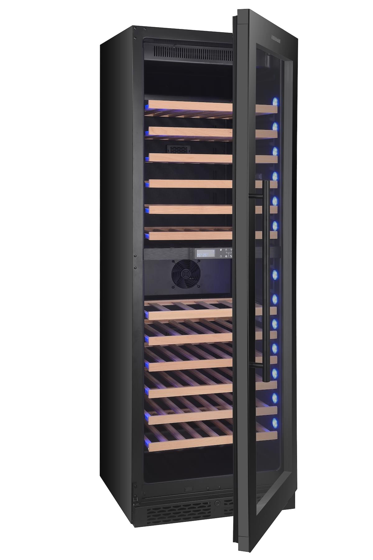 - Χωρητικότητα (0,75lt std) με ξύλινα τηλεσκοπικά ράφια: 108 φιάλες (τύπου Bordeaux)